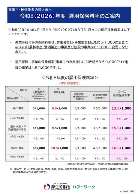 令和8年4月1日から令和9年3月31日までの雇用保険料率についてお知らせいたします。